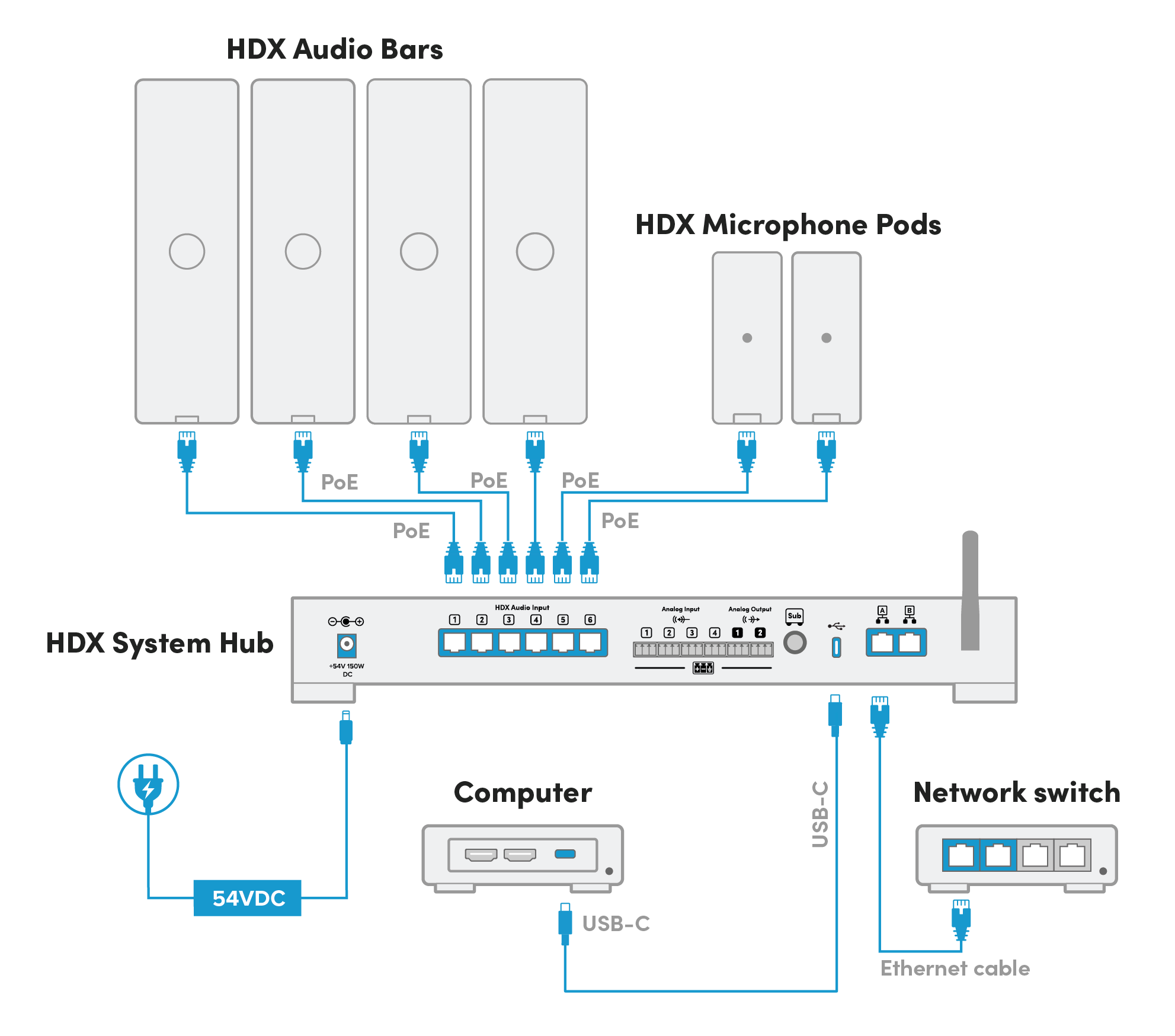 The audio bars and microphone pods plug into the system hub. The HDX system hub is IP-enabled, so a dedicated meeting room computer is not required. The HDX system hub supports USB connectivity, two ethernet connections, up to four balanced inputs, up to two balanced outputs, support Dante®, BLE (Bluetooth Low Energy) connectivity and Auracast™ transmissions.